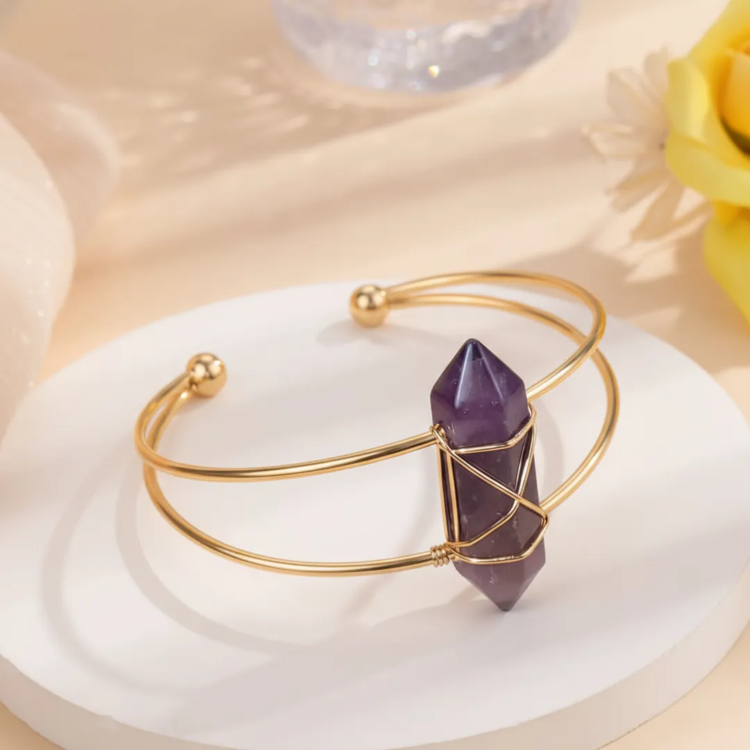 - Design: Wire-wrapped crystal on open cuff bracelet