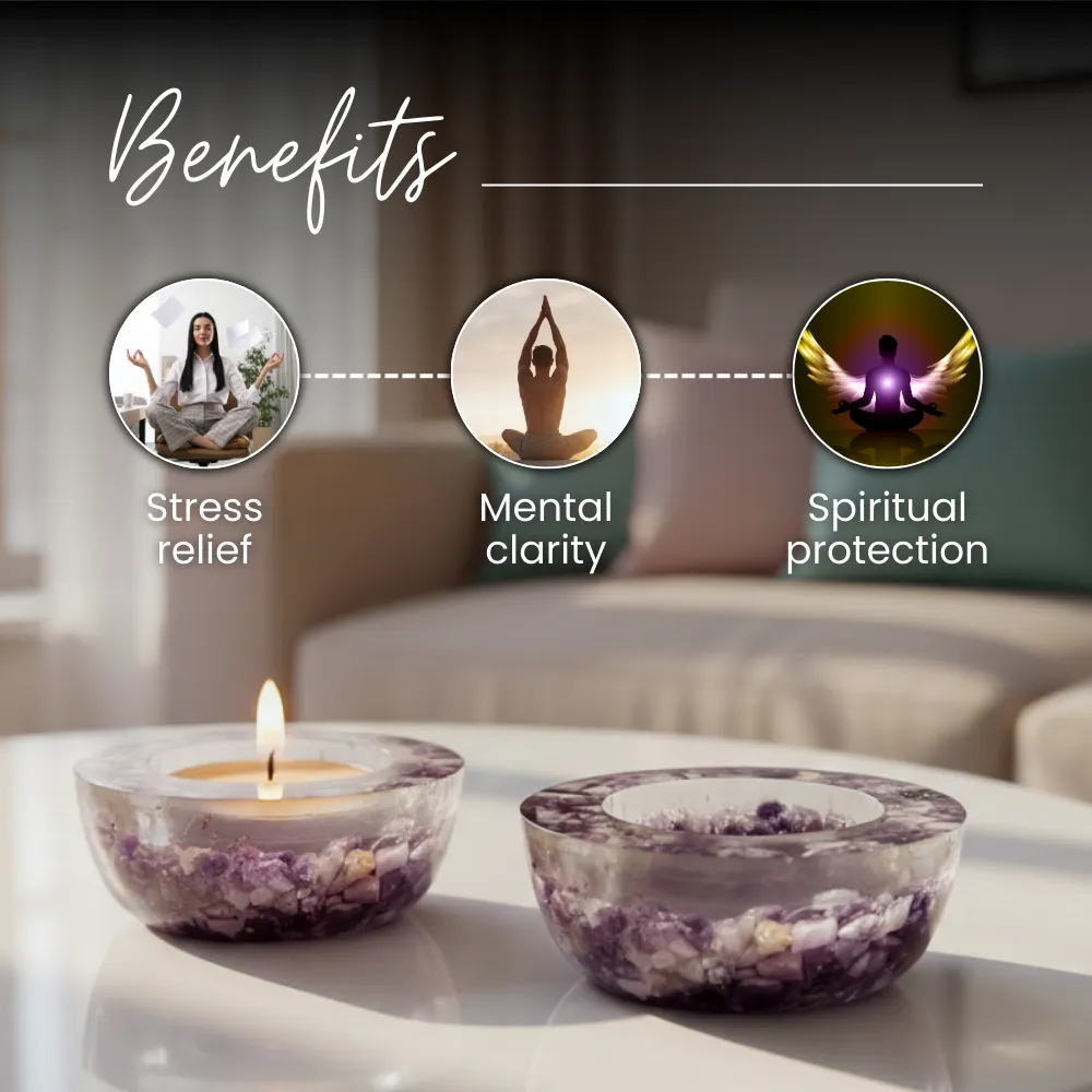 Amethyst Tea Light Candle Holder, a stunning fusion of natural amethyst crystal and Orgonite energy. Each piece is handcrafted to radiate peace, calmness, and positive vibrations. Ideal for Diwali pooja, meditation, or as a unique Diwali gift, this elegant crystal candle holder adds both spiritual harmony and aesthetic beauty to your space.