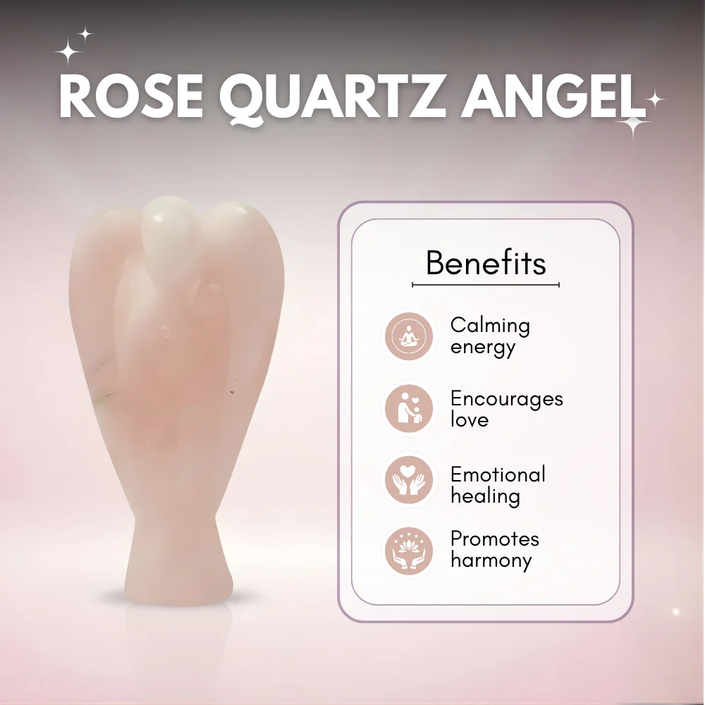 Rose Quartz, known as the stone of universal love, opens the Heart Chakra and promotes self-love, forgiveness, and harmony. Its angelic form enhances spiritual protection, emotional balance, and comfort, making it ideal for moments of reflection or healing.